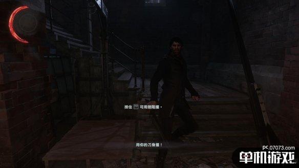 进入下一段街道后,迎面就是一名守卫,不过他只会缓缓的往前方走,此刻刚好前方所有守卫的视线都看不到这边,攀上右侧墙壁。之后可以看到一个向下的楼梯。