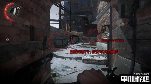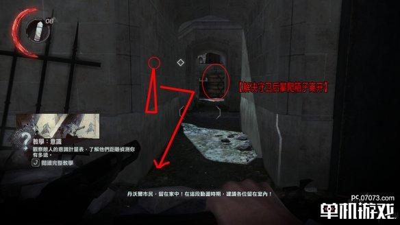 这边会有一名守卫前来(笔者尝试两次,有一次他没有来)。在这个洞口守株待兔,等待他来到后将其勒昏。之后如图所示踏着木箱回到街道。