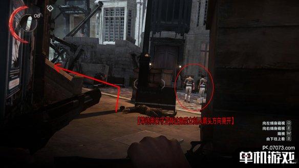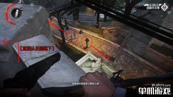 在解决这个守卫后直接顺着标示来到高处,可以在这里俯瞰整个地形,确定之后的潜入路线。在刚刚抵达这个鸟瞰点时,圆圈中的守卫正在与一个妇人交谈,趁他注意力分散时,从箭头方向离开高处。