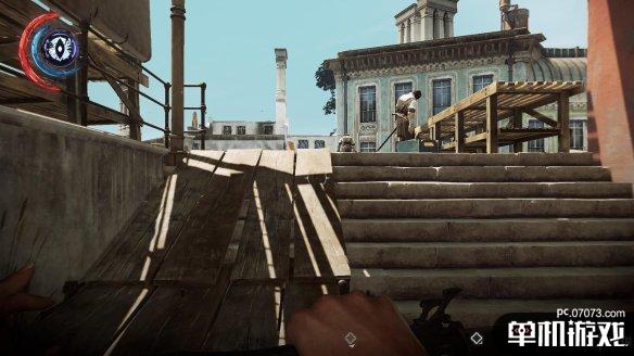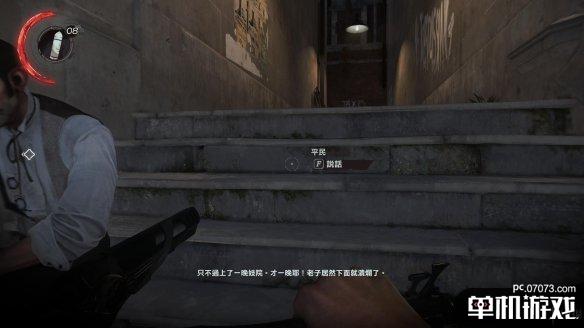 回到街道后直接往右走,这里遇到的平民不会引起警觉,但如果你当着平民的面进行任何攻击性动作,也会引发警报的,必须注意这一点。这里从台阶直接往上。沿着通道走。