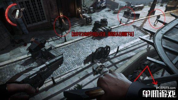 这边笔者选择的方式是从左侧楼梯上去,先解决上面的两名敌人,然后再找到巡逻守卫的背身角度,这样就能顺利解决三名守卫。