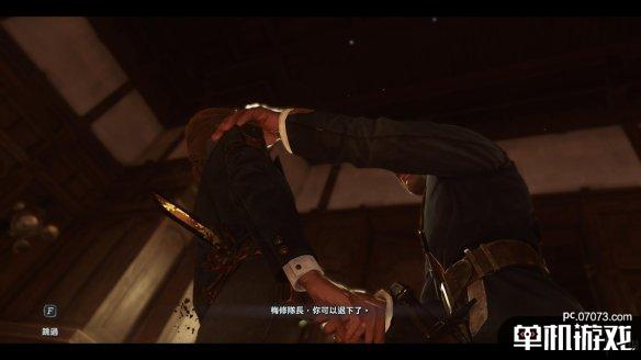 靠在门后偷窥一番,两个守卫在交谈一阵后,其中一个就会从左侧楼梯下楼,等待他离开视线后,潜行上前勒昏剩下的一名守卫。