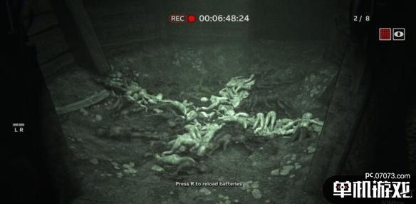 这条阴森的小道,两边树林里时不时有声音,我可不想打草惊蛇,往前,是一个通往地下的路。 一进去,就在地上看到了一只缺眼睛的泰迪熊。我看到了一本圣经,管它呢,再往前走,看到了诡异的一幕,几十只还没发育完成就从肚子里强行拉出来的婴儿,他们堆成了一堆,天花板上被某人刻了一个十字孔,里面散发出白光刚刚好给婴儿造成了白光反应。