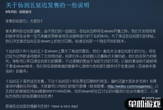 官方在声明中表示,因为发现了现有的版本存在会有一定几率触发导致游戏无法继续进行的下去的BUG,为了保证各位玩家们的体验,决定推迟《仙剑五》在steam上的发行日期。《仙剑四》不受影响,仍将在8月28日发售。