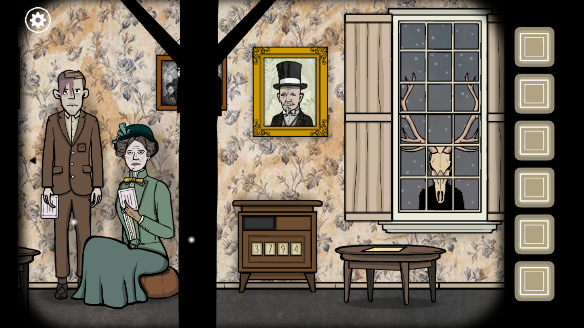 2、第二幅挂画掉下来后,后面有个转盘,转动要如下位置,我没来及截图,凑合看吧。上面下来一把梯子,上楼。看到望远镜,把三张卡牌都放上去,根据卡牌图案点击连线,位置参考下图。完成4张卡牌后,根据画像上的图案连线,第一次得到妈妈的提示,第二次得到乌鸦先生的提示。得到镜片。