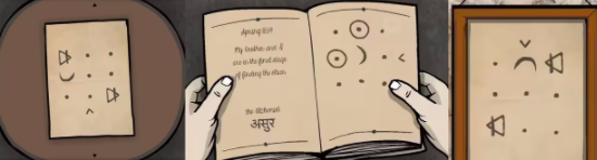 1、观察桌上的三个人偶造型、树枝上吊着的娃娃、树洞里的娃娃和外形和符号,以及柜子外面的符号。去帐篷的占卜师那里,根据对应的特征和符号,将占卜牌放到对应的符号上(根据占卜牌下面的英文可以简单猜出),具体位置如下图,简单翻译了一下。摆放正确后,Ida给了一把钥匙。