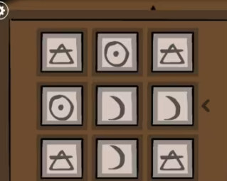 2、查看小柜子,三个按钮分别控制三层符号的移动,拼成图案,如下图,柜门打开得到一枚硬币,顺便取走上面罐子旁边的硬币。把两枚硬币改在James的眼睛上,他张开嘴巴,吐出另一个眼睛。