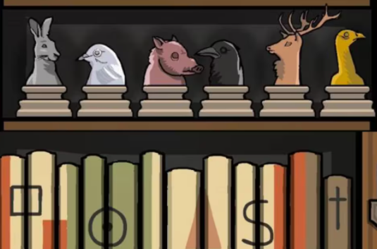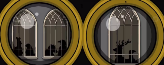 3、打开窗户,用望远镜开窗外,看到城堡大门两边闪烁的窗户,看到剪影,根据剪影去排列书架第二层的雕像,参考下图,第二个开关打开。