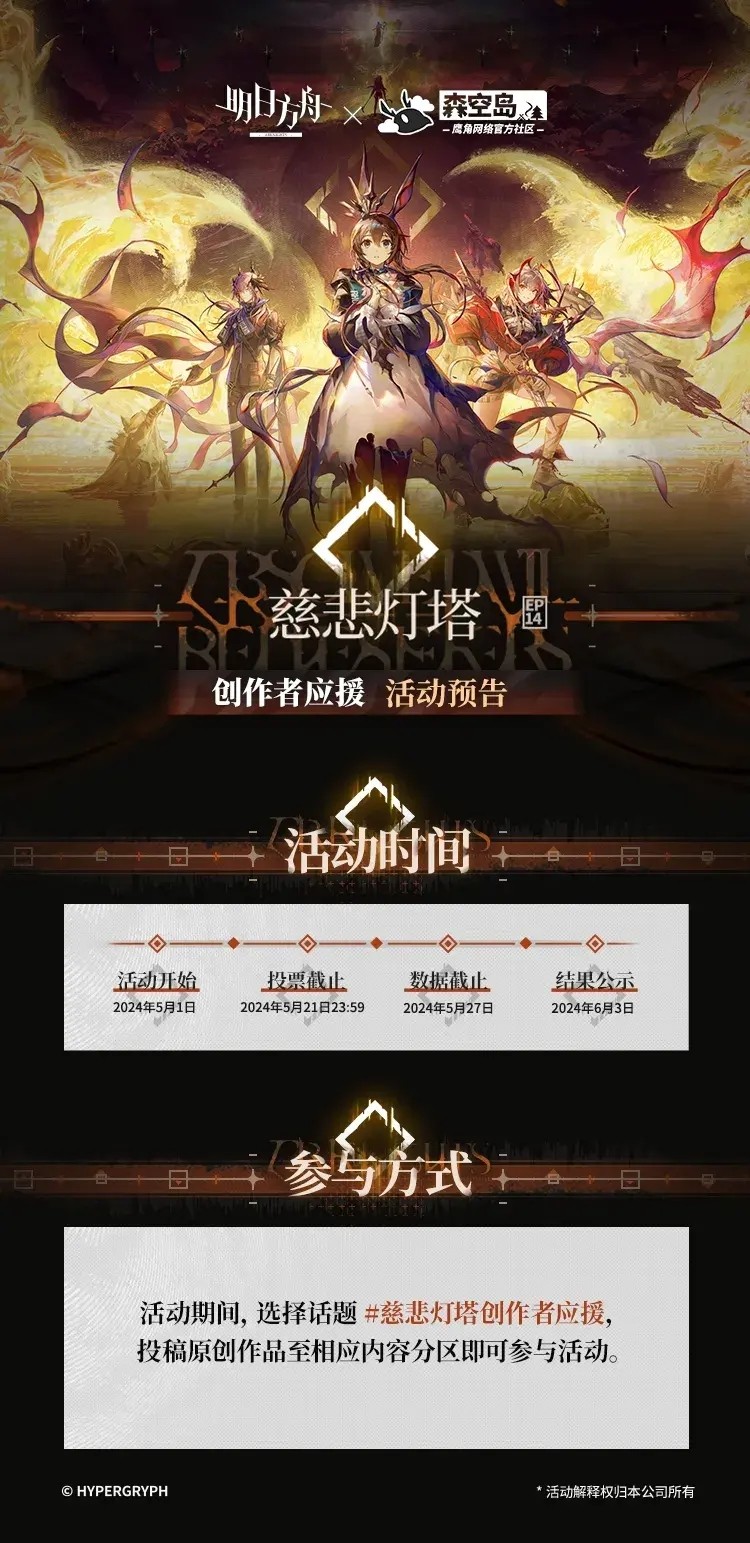 明日方舟×森空岛《慈悲灯塔》创作者应援活动将于5月1日正式开启。