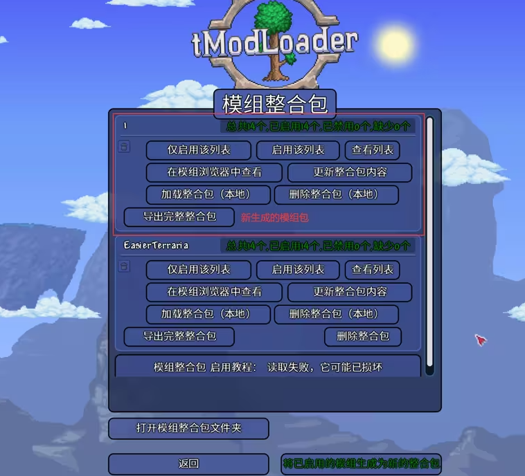 完成后在游戏内还需要点击加载整合包(本地)才能启用。
