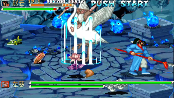 倚天剑是整个游戏中拿的第一把剑,具体拿法相信老一辈的玩家应该都还勉强记得在哪个地方拿。是的,火剑就是在打完第一关孙姬之后第二关溶洞小地图的右上角密室里面。但是,除了黄忠拿到金蝎子能够完成单人进入密室,其他人物必须至少保证两个玩家才能进入密室,才能完成拿剑。