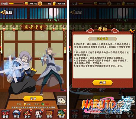 因为阵容选错而后悔?迟迟不能获得想要忍者?《火影忍者-忍者大师》全新忍者变身功能开启,完美解决想要变换阵营的难题!在忍者变身系统中,利用相应的忍币和忍玉,同阵营同品质忍者可进行无损耗转换,当达到90级时还可进行不同阵营忍者间的变身。更厉害的是,普通忍者也有机会变身稀有橙色忍者哦。你的忍队还有忍者未集齐,别着急,试试看《火影忍者-忍者大师》全新忍者变身功能吧!