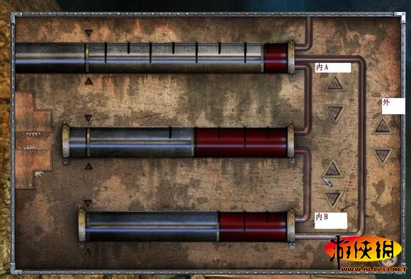 前面瓶子里使用德古拉的血,打开游戏试管按顺序8-5-3,看到按钮里面有两个按钮,外面有一个按钮。里面的两个按钮上面的用A表示,下面用B表示。依次是外下-内B上-外下-内B上-内A上-内B上-外下-内B上-外下。